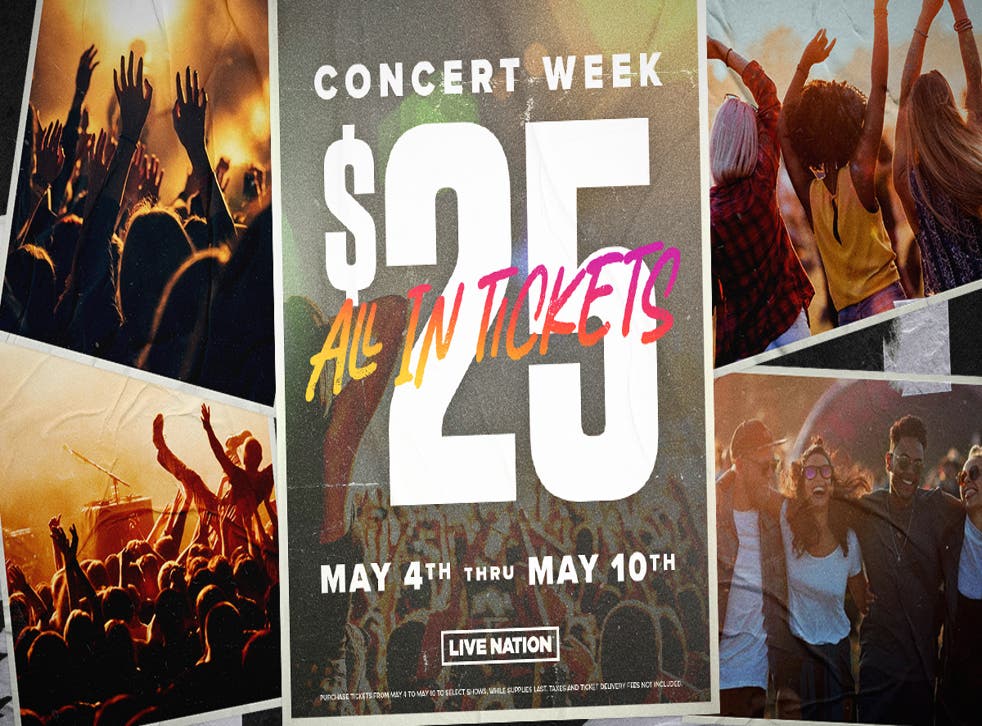 Live Nation will soon bring back its Concert Week promotion by offering live music fans 25 all. There will be tickets for 50 tours and 1000 shows at venues across the nation. Add To Trip Details. Live Nations National Concert Week begins today and runs through May 7 offering 20 all-in tickets meaning no extra service fees theyre 20 full stop for a variety of concert events.